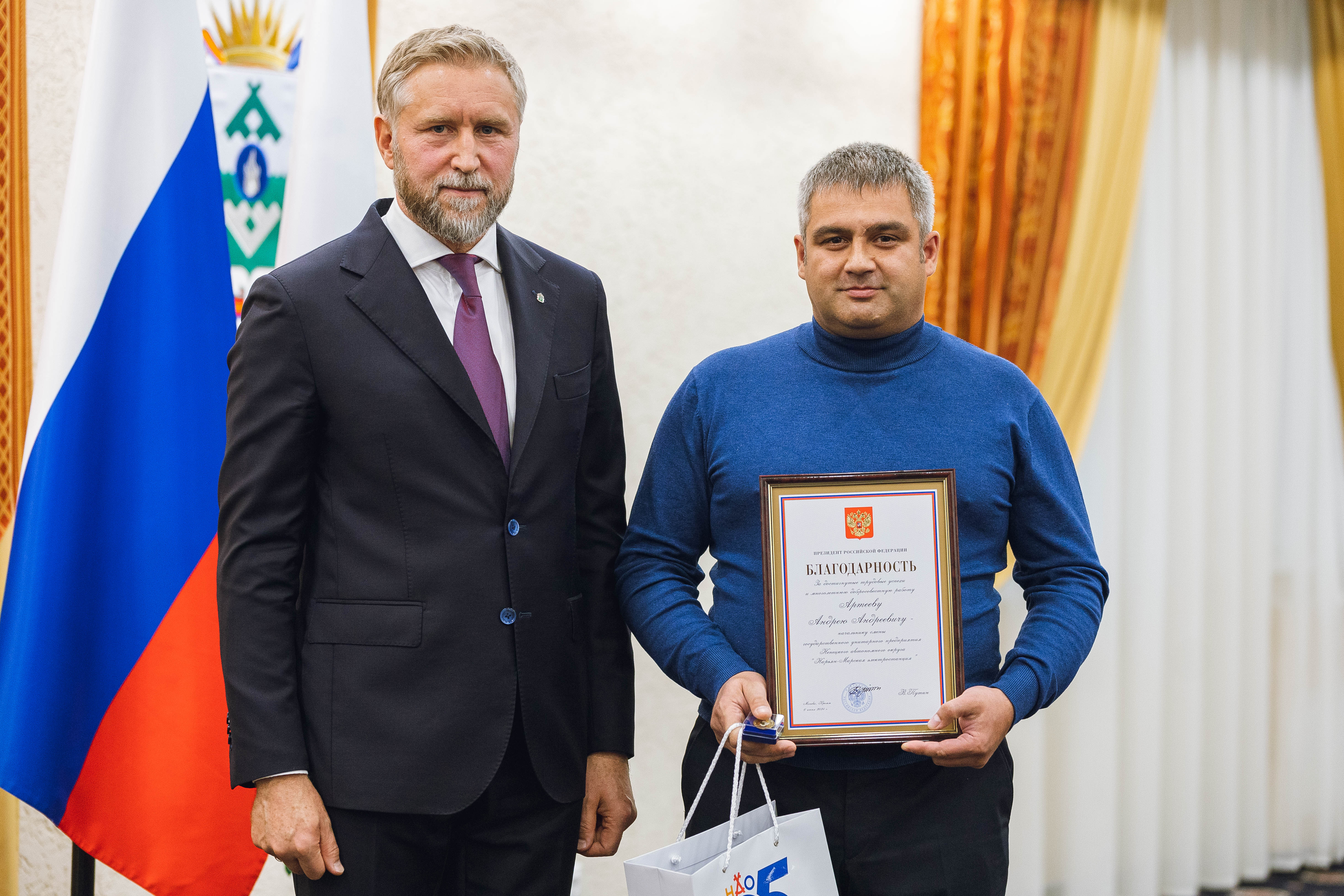 Распоряжением Президента Российской Федерации от 6 июня 2024 года № 163-рп за достигнутые трудовые успехи и многолетнюю добросовестную работу Благодарность Президента Российской Федерации объявлена Артееву Андрею Андреевичу, начальнику смены государственного унитарного предприятия Ненецкого автономного округа «Нарьян-Марская электростанция».