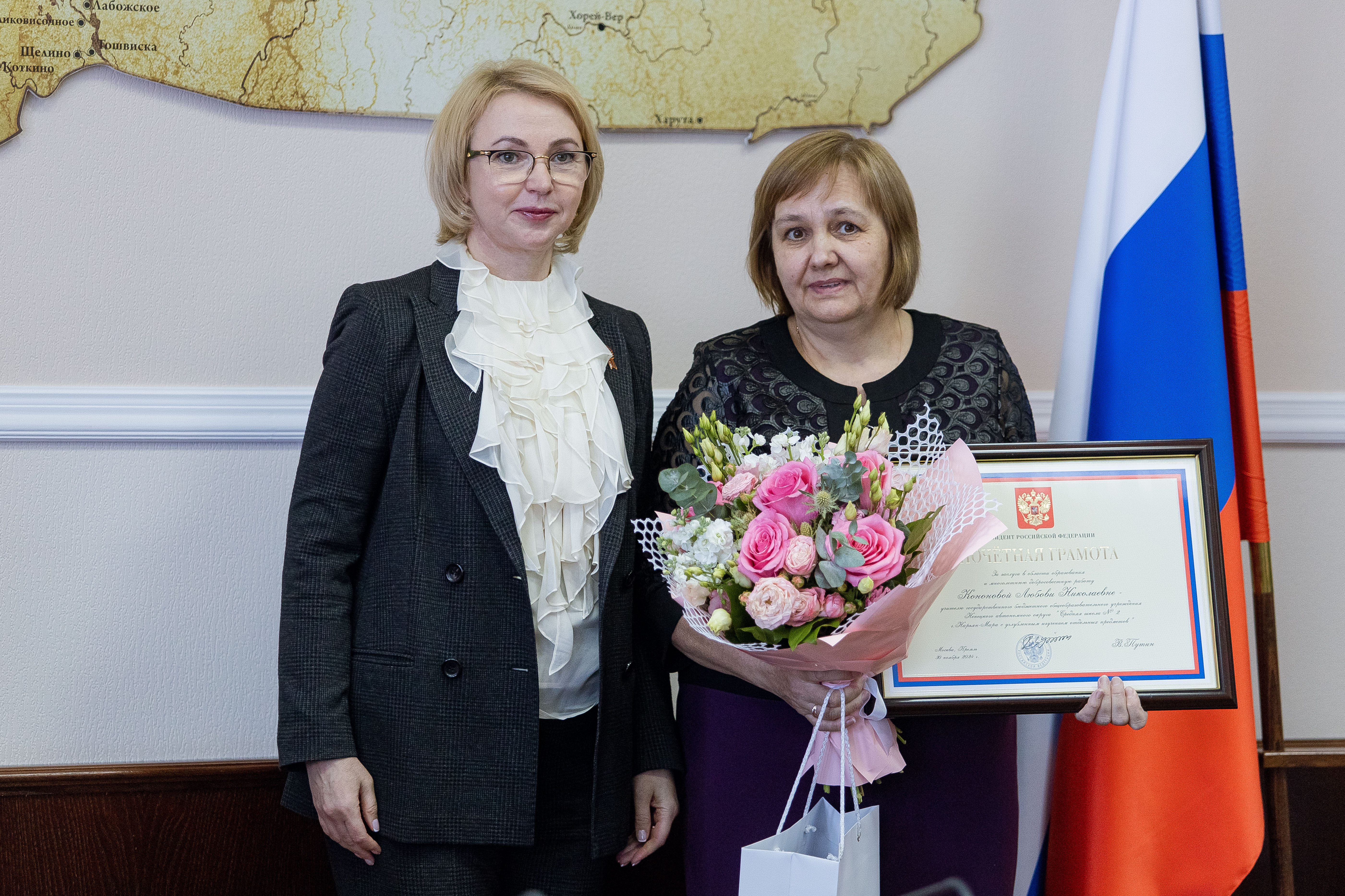 Распоряжением Президента Российской Федерации от 30 ноября 2024 года № 386-рп за заслуги в области образования и многолетнюю добросовестную работу Почетной грамотой Президента Российской Федерации награждена Кононова Любовь Николаевна, учитель начальных классов ГБОУ НАО «Средняя школа № 2 г. Нарьян-Мара с углубленным изучением отдельных предметов».